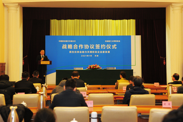 1月18日,天津理工大学校友会与中国民生银行天津分行签署战略合作协议暨校友企业家联合会金融服务主题讲座在天津市政协俱乐部举行。中国民生银行天津分行党委书记、行长李稳狮,副行长张含玮、孙超,校党委副书记郭滇华出席签约仪式。